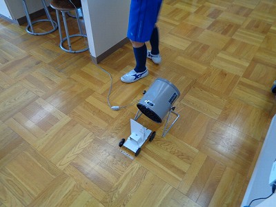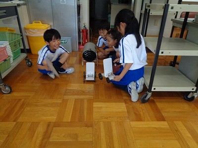 理科では、送風機の風を利用して、車を動かします。