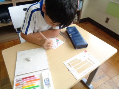 今日は、あて名や住所など表面を書き、裏の文面も考えて、イラスト付きで丁寧に仕上げていきました。
