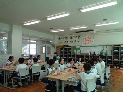 給食は、赤組と白組に分かれ、今日から3年生の教室に入られた教育実習の先生とも
