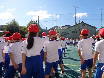 秋空が広がる中、運動会に向けて全校練習に取り組んだ3年生。