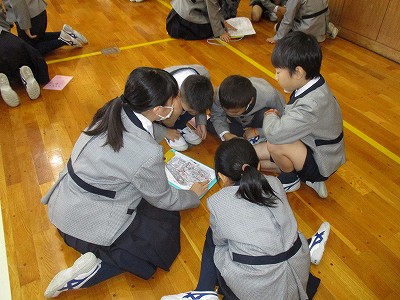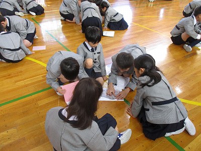 メンバーの名前の確認、班のめあて、ウオークラリーの方法等を6年生の班長さんから伝えてもらいました。みんな真剣に聞いています。