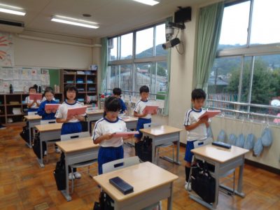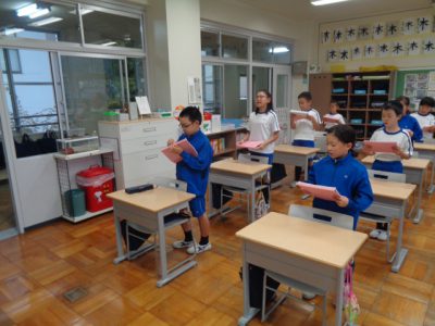 明日の音読発表に向けて、先週から「松尾芭蕉の俳句」を読んでいます。テンポよく読むことや、聞く人に伝わるように、言葉のはじめをしっかり言うことを大切に練習しています。