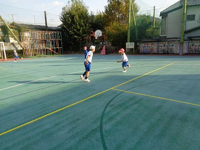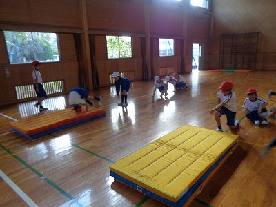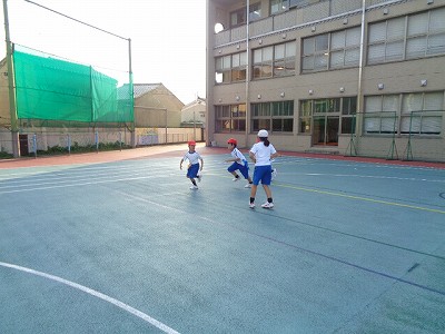 台上前転の練習をしてから、運動場に出て来週から始める「タグラグビー」の練習をしました。タグを取ったら「タグ!」と言うこと、ボールは前にパスしない、二つのルールの確認をしました。