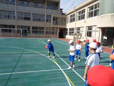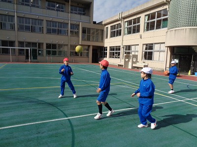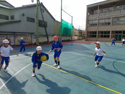 体育科は、タグラグビーのパスのレベルアップ練習から始めました。