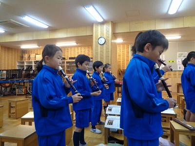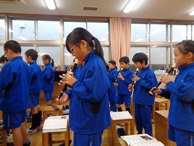 2時間目、音楽室から「聖者の行進」のリコーダー奏が、きれいに聞こえてきました。二つのパートに分かれて二重奏に取り組んでいます。