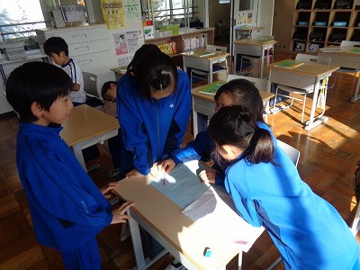 休み時間は、昨日のクラス全体での話し合いをもとにして、有志のメンバーが、月影集会に向けて「どんな発表をするか」について相談しました。