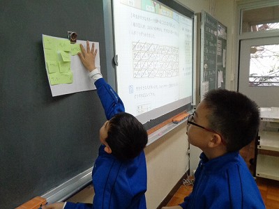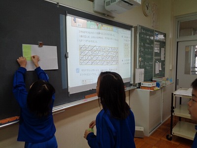 教科書を使ってて、アンケート結果をわかりやすく表にまとめることを確認し、最後に3年生の好きな運動を4つの中から選んで、表に整理しました。