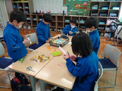 「かざり係」は、かざりを作り始め、「司会係」は、はじめの言葉や終わりの言葉を考えました。