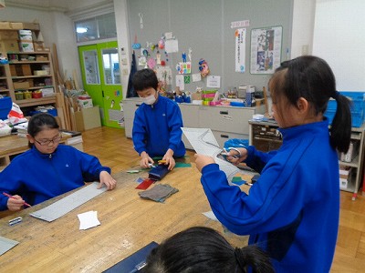 一人2つは作ります。3年生からは、「大変やけど、がんばって作ろう!」、という気持ちが感じられました。6年の班長さんにありがとうの気持ちが伝わるように仕上げていきます。