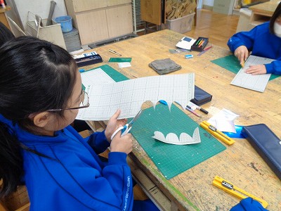 図工では、6年生の班長さんにおくるプレゼントを作り始めました。プレゼントは、「王冠」です。形を決め、下書きし、切っていきました。