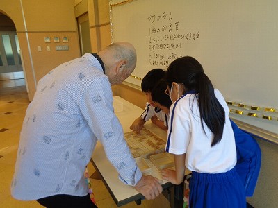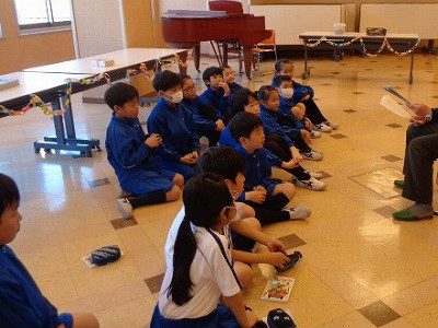 会が始まりました。はじめは、祖父母の方から昔の生活や遊びについてお話を聞きました。みんなはそのお話に興味津々です。質問もたくさんしましたが、ていねいに答えてくださりました。