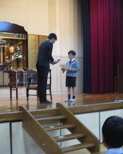 マラソン大会で一位になった児童の表彰がありました。2度目の表彰です。
