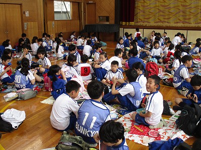 そして、いつもの給食の時間に、体育館でお弁当を食べました。