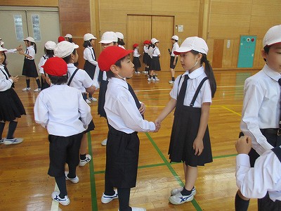 自分の名前を言ったり、尋ねたり、学年を言ったり、話せて良かったは・・・等を、握手をしながら言うもの。だまっていたり、相手を探していたりする間に、先生や4年生のオニ役に、タッチされてしまいます。