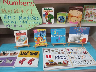 1年生は、算数で「なんばんめ」や「いくつといくつ」等の数の学習に取り組みました。英語科もそれと関連づけ、ギャラリーに「かずの英語絵本」を10冊、展示しています。