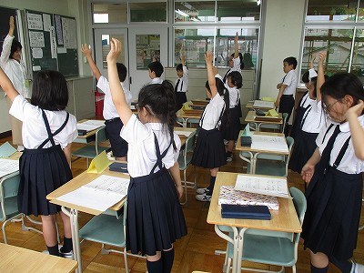 基本的な文字の形を、体を動かして作ったり、リズムに合わせて歌ったり・・・、