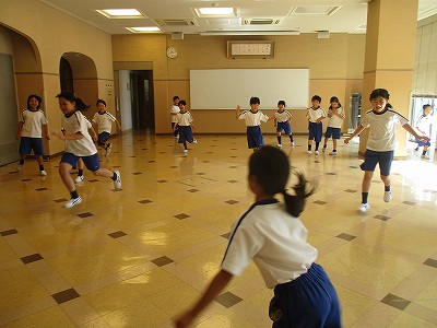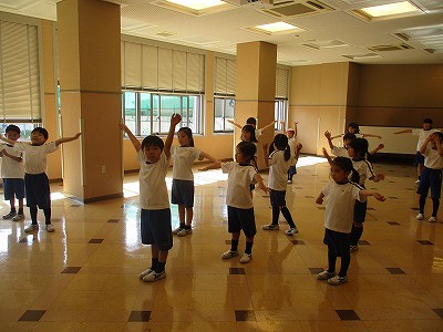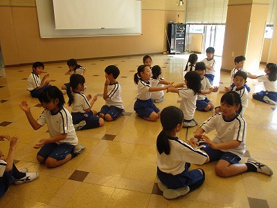 一年生に、上の学年のお姉さん達、お兄さん達が、手の動きを教えます。