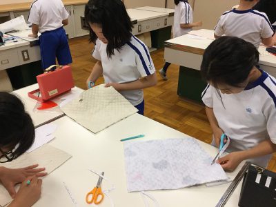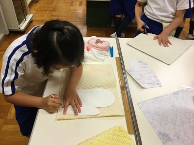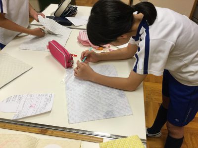 使う布は、“キルティング”。先生から、型紙を使った布の準備を教わっています。