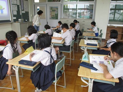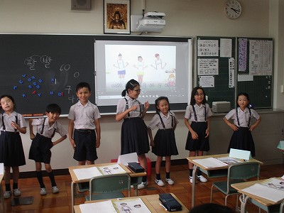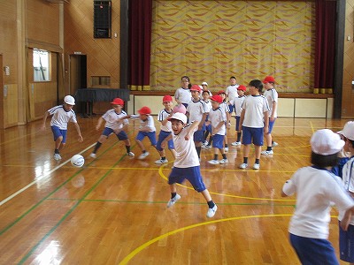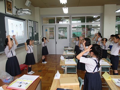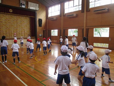 4年生が前で見本を見せてから、3年生も(しぶしぶ・・・?)前で取り組みました。