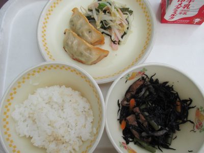 もやし、わかめ、キャベツ、ハムを合わせたサラダです。さっぱりした味に仕上げて、ぎょうざと食べても合うように考えました。ぎょうざはコンベクションオーブンで焼くので、皮がパリッと固くなりますが、しっかりかんで食べてくれていました。