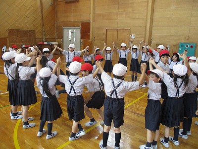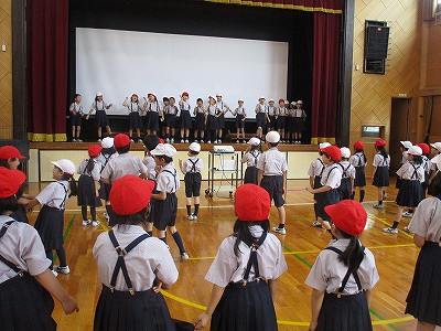 「文教にんじゃ」や「文教小へ行こう」の歌を舞台で歌って、他学年も一緒に歌ったり、ペアになって、くるくる回ったりしました。楽しいひと時でした。
