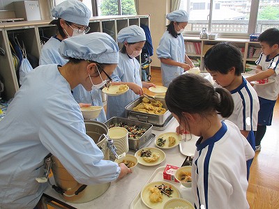 給食当番は、5年生6年生が担い、準備をします。
