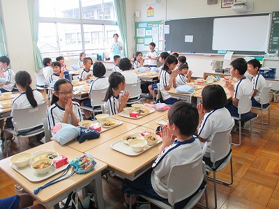 39の縦割れんげ班が、割り当てられた各教室で一緒に給食を頂きます。