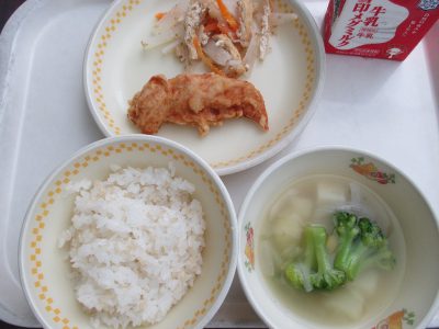ささみにしっかり下味をつけてから、片栗粉と小麦粉を混ぜた粉で揚げています。ささみは、たんぱく質が豊富な食品です。たんぱく質をとって、運動をすることは成長期の体作りにかかせません。
