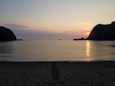 早朝5時15分に宿舎を出発し、5時半に浜辺付近に集合しました。
