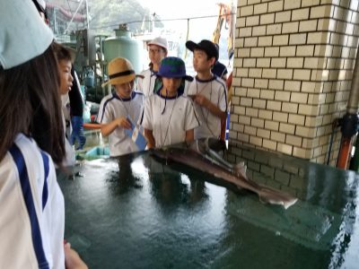 子ども達は、養殖している水産物の種類や漁獲の様子、養殖の流れなどを教わりました。