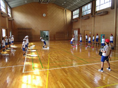 体育館で、威勢のいい声で、エール交換や拍子に合わせた応援練習をしています。