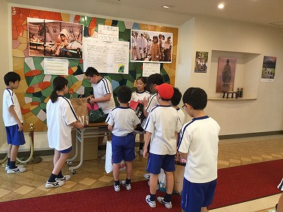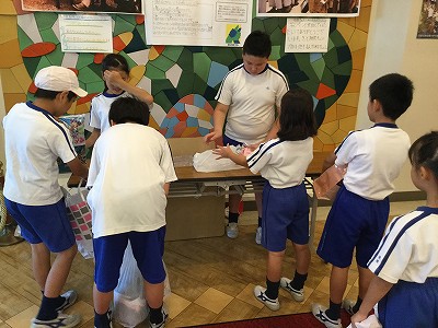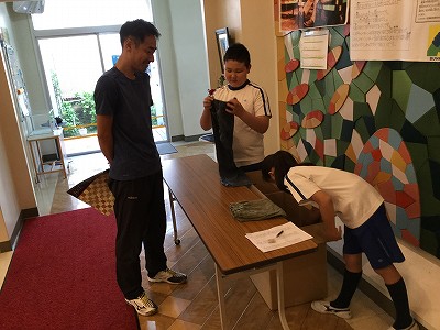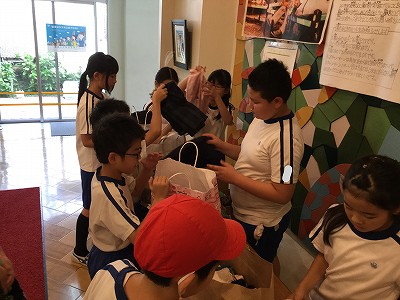 チラシ効果抜群!中間休みに「古着を持ってきている人は、玄関の…」と、放送を入れると、続々と受付にやって来てくれました。