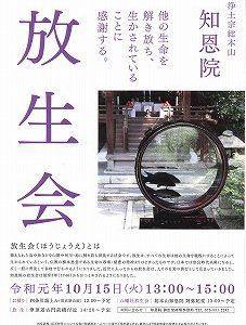 「放生会(ほうじょうえ)とは、捕えられた鳥や魚などを山野や河川・池に解き放ち供養する法会です。放生は、すべての生命は他の生命を犠牲にすることによって生かされているという、仏教の根本思想である生命の尊重・慈悲の精神よりはじまったものです。日本では奈良時代以降になると、広く一般に普及して各地で行われるようになりました。近世に入ってからの放生会は、人々の日常の善行として広まっていきました。知恩院の放生会は延享3年(1746年)からおつとめされるようになりました。」