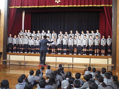 礼拝・音読タイム後、2,4,6年生が、「学びと力の発表会Ⅱ」に向けて、合同合唱練習をしました。