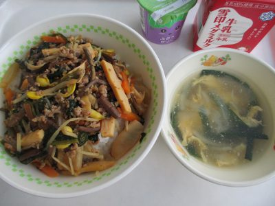 ビビンバとは『ピビダ(混ぜる)+パッ(ご飯)=混ぜご飯』という意味があります。韓国では、本来残りご飯に、ナムルやコチュジャン、ごま油などを混ぜ、ちょっと小腹が空いた時に食べる手軽な料理のことをいうそうです。彩りもきれいで、たくさんの新鮮な野菜が使われるのも特徴だそうです。給食では、すべて炒め合わせて調理しました。