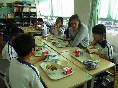 4年生の教室で一緒に給食をとるポール先生。写真では真剣な表情で子ども達の話をじっくり聞いていますが、いつも、おいしいご飯と楽しいお話で、みんな笑顔いっぱいです!