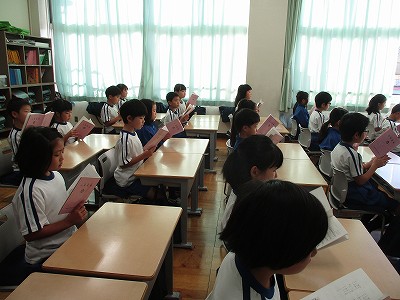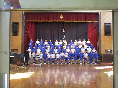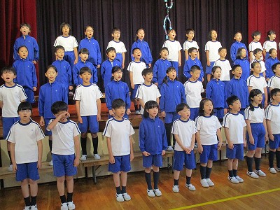 写真は、2年生4年生です。「学びと力の発表会Ⅱ」に向けて、秋を代表する日本の童謡3曲を歌っています。
