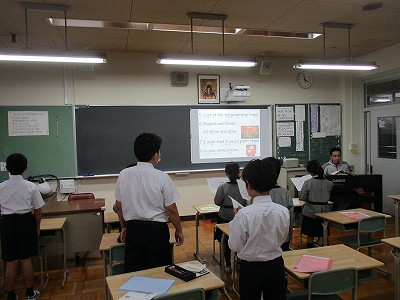 最後に、英検5級の文法問題やリスニング問題を、スクリーンを見ながら、クイズのように取り組みました。1月に本校で受験する英検に向けて、がんばっています!