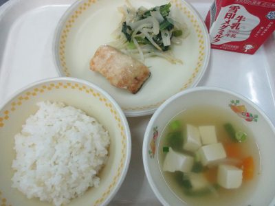 すまし汁は、昆布とかつおを使って出汁をひいています。玉ねぎ、人参、ねぎ、豆腐とシンプルですが、出汁で煮込んだ野菜のおいしさが感じられます。また、出汁をしっかりひいて、塩分を抑えられるよう考えています。