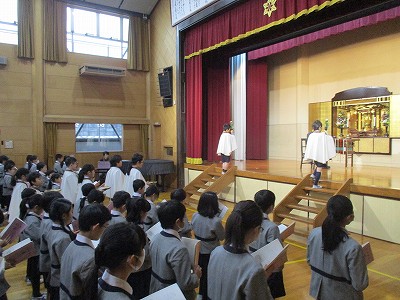お互いを大事にすることや、明日の月かげ集会のこと、共生ともいきで、仲良く楽しい学校生活を誓って、礼拝に臨みました。