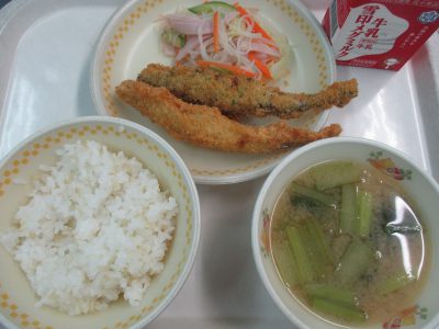 小松菜は、昨日も和え物に使われていた野菜ですが、今日は味噌汁のメインとして使いました。出汁の味をふくんで、おいしく調理できました。