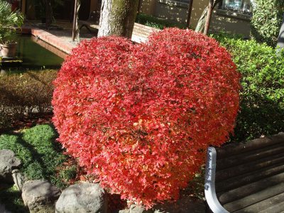 2つ目は、池の横にある赤々と紅葉したドウダンツツジ。