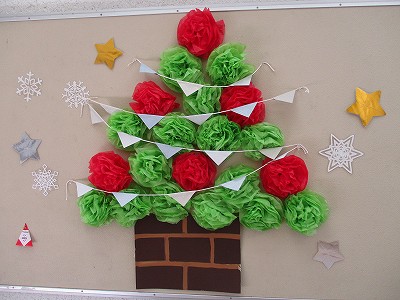 先日、インフォメーション委員会で作ったクリスマスツリーを玄関に飾っています。