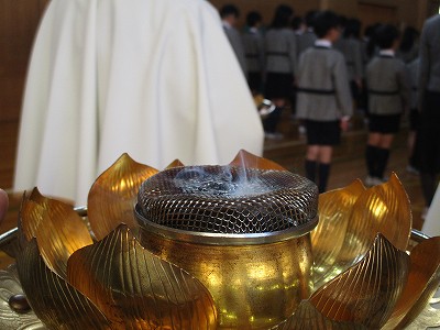 礼拝係は、光(蝋燭の火)、香り(お線香)、お花をお供えします。