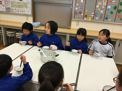 体の芯から温まる、やさしい仕上がりです。「塩味、いい感じ~」と、おいしくいただきました。外は枯れ葉が舞い、突風が吹く日和でした。この時だけは、みんなのほっぺが、ほんのり赤くなっていました。