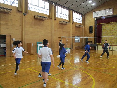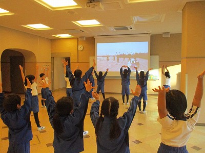 3学期初の英語朝体操です。まずは、しっかりストレッチ!