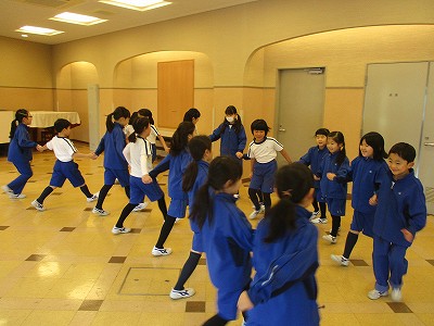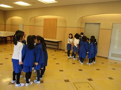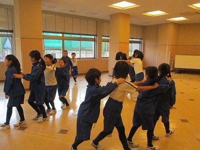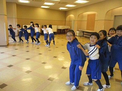 ところが、最後の決戦を目前に、突然、新ゲームのスタート!「キツネとにわとり」ゲームです。一番後ろのひよこがタッチされないように、前にいるにわとり達が守ります。いくら英語でマジックワードを言っても、タッチされてしまうルールでした。