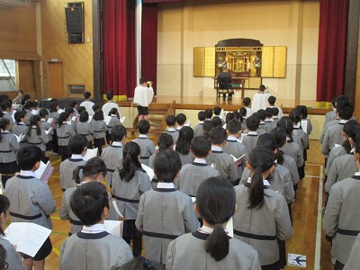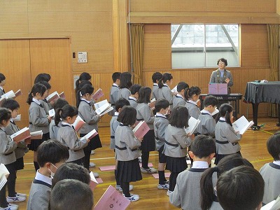 その後は、教頭先生と一緒に、仏教聖歌「四弘誓願」の全校練習をしました。