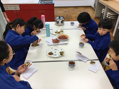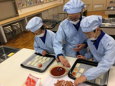 6年生と4年生のコンビは、薄切りにしたお餅に、ケチャップを付けて広げています。昼休みに集まって、先に切り分けておいたので、作業が大変スムースです。