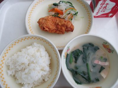 ほうれん草の味噌汁は、じゃがいも、玉ねぎ、ベーコン入りで、少し洋風な味噌汁でした。昆布などの出汁のうま味と、ベーコンの脂が合わさって、いつもと少し違う味噌汁になりました。